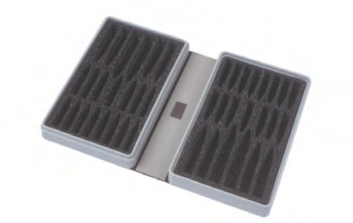 - A rigid plastic box holding 42 ampoules of varying sizes
