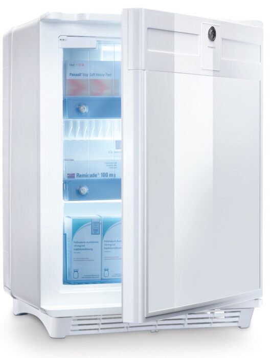 Dometic Silencio DS301H Refrigerator. The perfect solution for hospitals and health centers to keep heat sensitive medicines between +2 °C and +8 °C. Integrated fan for constant temperature and audible warning if door left open for 20.