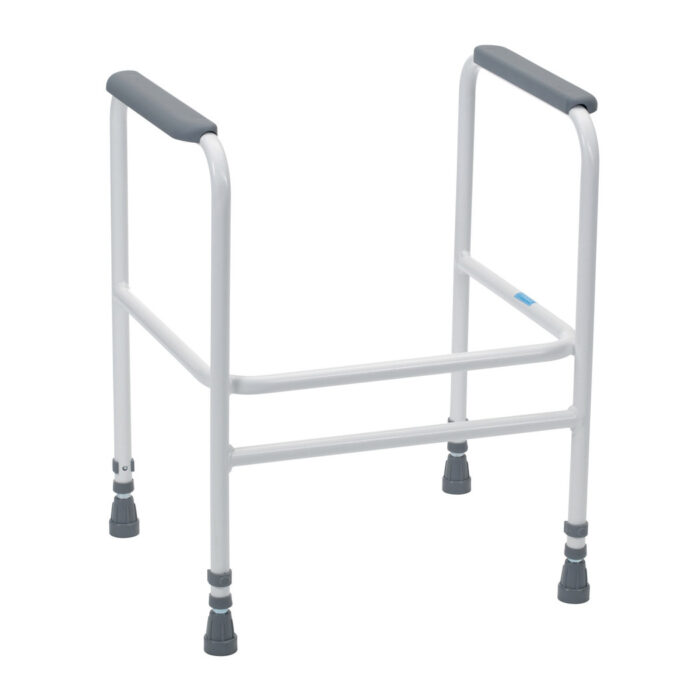 • Free-standing, rigid double strut steel frame that locates around toilet to offer support with sitting and standing