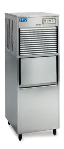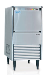 One that produces ice cubes (cylindrical) of 30 to 40g depending on model; and crushed ice producing ice ideal for filling packs and modelling to fit any item or object which requires keeping cool.