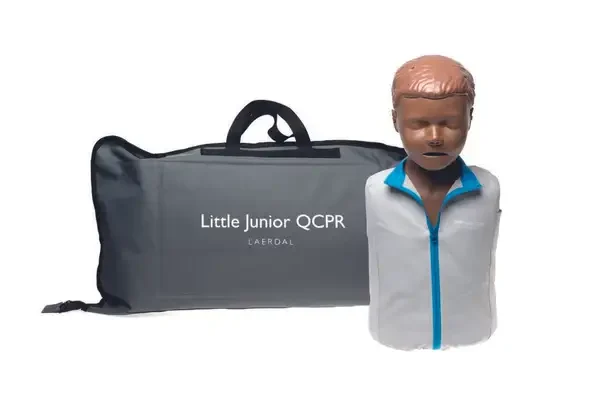 Little Junior QCPR Dark is a CPR manikin designed to represent a four-year-old child. The manikin is Bluetooth enabled for QCPR app compatibility and includes a port to connect a SkillGuide device.