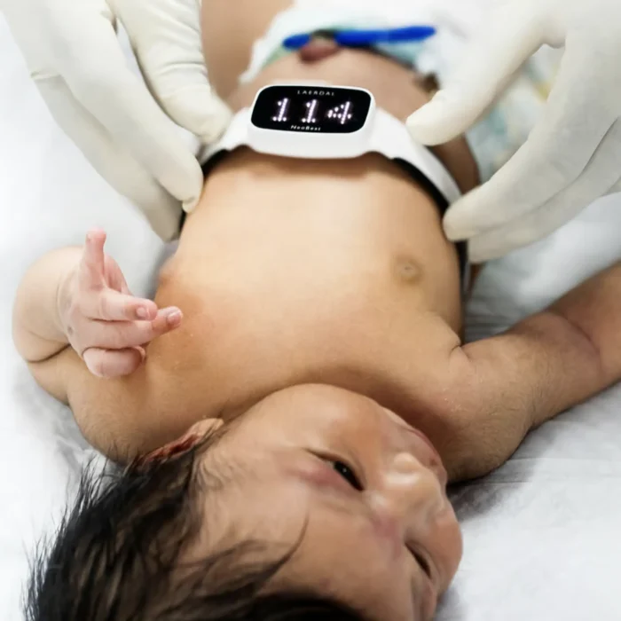 NeoBeat is a newborn heart rate meter designed for fast, accurate assessment immediately after birth. Placed directly on the baby’s wet torso, it displays real-time heart rate within seconds using ECG-based dry electrode technology—no leads, adhesives, or skin preparation required. Continuous heart rate visibility allows the whole clinical team to focus on the baby during critical moments. NeoBeat provides objective, reliable measurements recommended for delivery-room use and supports improved clinical decision-making. It is also available in a Mini size, offering the same performance in a smaller form factor to suit different newborn needs and clinical preferences.