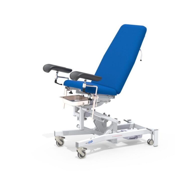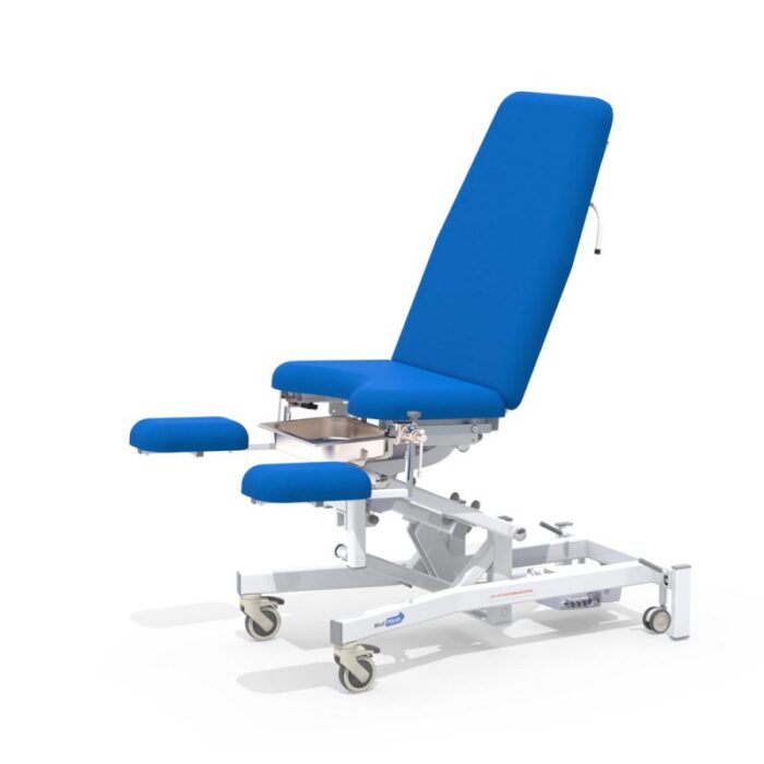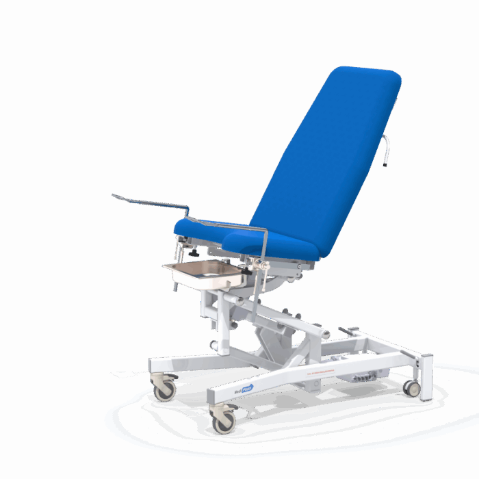 The renown GP gynaecology plinth features improved access and ergonomics for the clinician and enhanced comfort and dignity for the patient. Effortless adjustment is ensured with electric motors for height and tilt. The electric seat also enables Trendelenburg. Fully adjustable foot stirrups/knee troughs or upholstered footpads can be provided as standard, as is the stainless steel tray. The Medi-Plinth operators stool is a key optional accessory which can be co-ordinated with the plinth. Images shows plinth with Knee Troughs, Detachable headrest and Fold down arm loops show, are not included as standard.