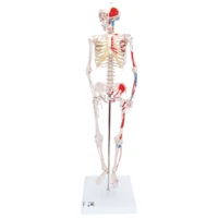 The skull can be removed and disassembled into three parts (skullcap, base of skull, mandible). The arms and legs are removable. The hip joints are specially mounted so their natural rotation can be demonstrated. The portrayal of the muscle origins (red) and insertions (blue) on the left half. This mini skeleton can be taken off of the base when required.