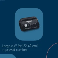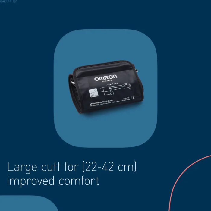 The monitor is supplied with a wide cuff (22–42 cm), suitable for most adult upper arm sizes.