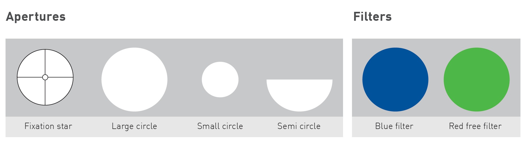 - Easy-to-use wheel with 4 apertures and 2 filters (fixation star, large circle, small circle, semi-circle, blue filter and red free filter)