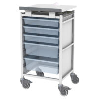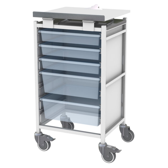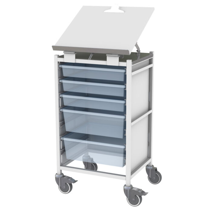 Fixed height, portable chart board trolley with lower storage trays. Single column medical storage tray trolley with hinged writing board top.