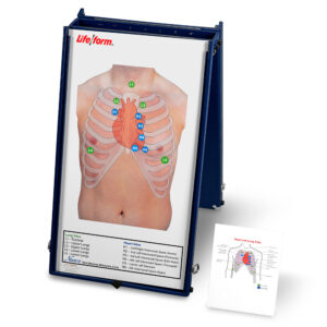 Anterior anatomical drawing showing the five anterior lung and six anterior heart sites complete with hard storage/display case, SmartScope#8482 and wireless remote control technology. Hear realistic heart and lung sounds while recognising appropriate placement of the SmartScope in conjunction with what was heard.