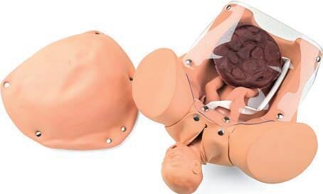 • Disposable umbilical cords with clamps, easily replaceable extra vulva, powder to make simulated blood, a modular pregnant belly overlay with permanently installed fetus for training practice of the Leopold’s maneuver to determine the fetus’ lie by palpating its skull and kneecaps and a clear abdominal overlay to see positioning are all included