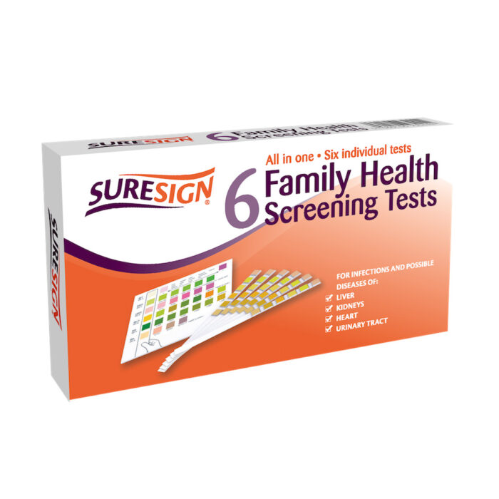 Family Health Screening Test is unique to Suresign.  It is a urine based test which detects nitrates, protein, urobilinogen, bilirubin, blood & specific gravity. All of these, if present or present at high levels can indicate illness or infection, mainly relating to the heart, liver, kidneys & urinary tract.
