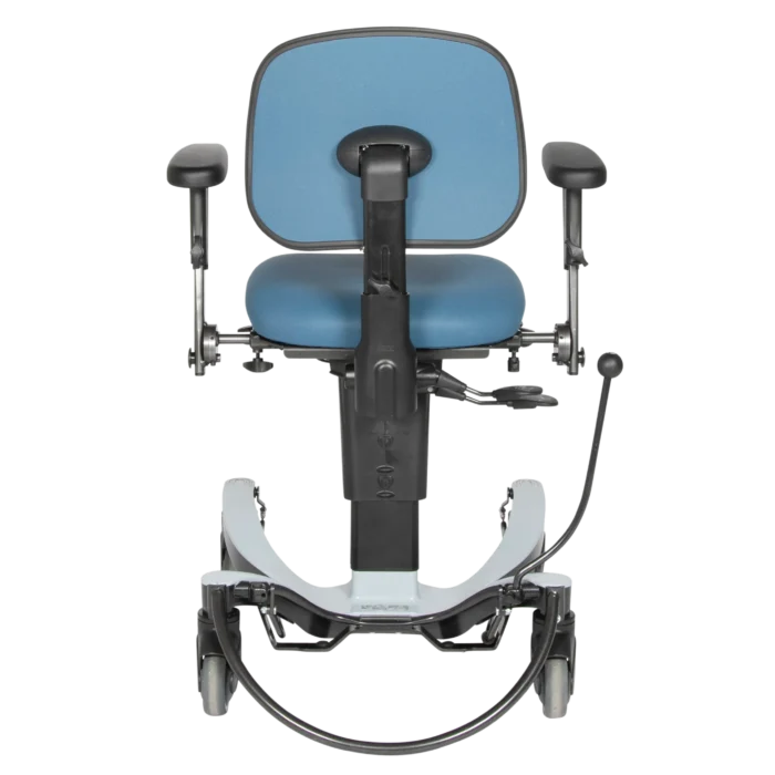 - The chair’s wheels and brake make it easy for the patient to move back and forth between their bed and the training equipment, and provide stability when the patient is positioned correctly at the equipment